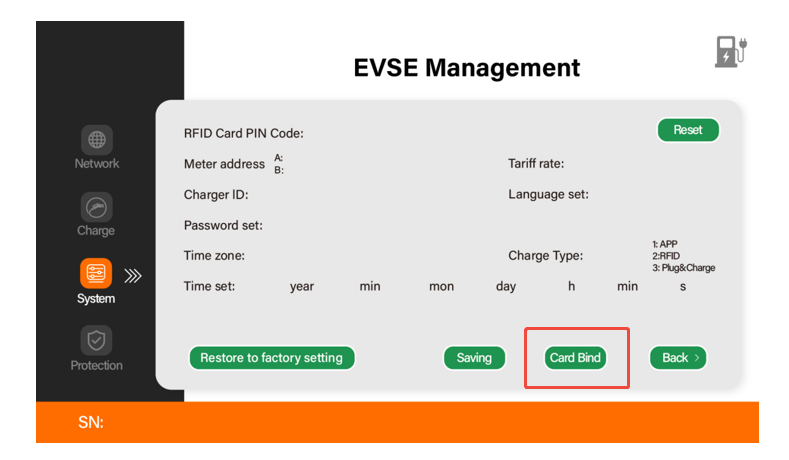 Find “Card Bind”, press it, and swipe the new card on the RFID reader to bind it to the charger.