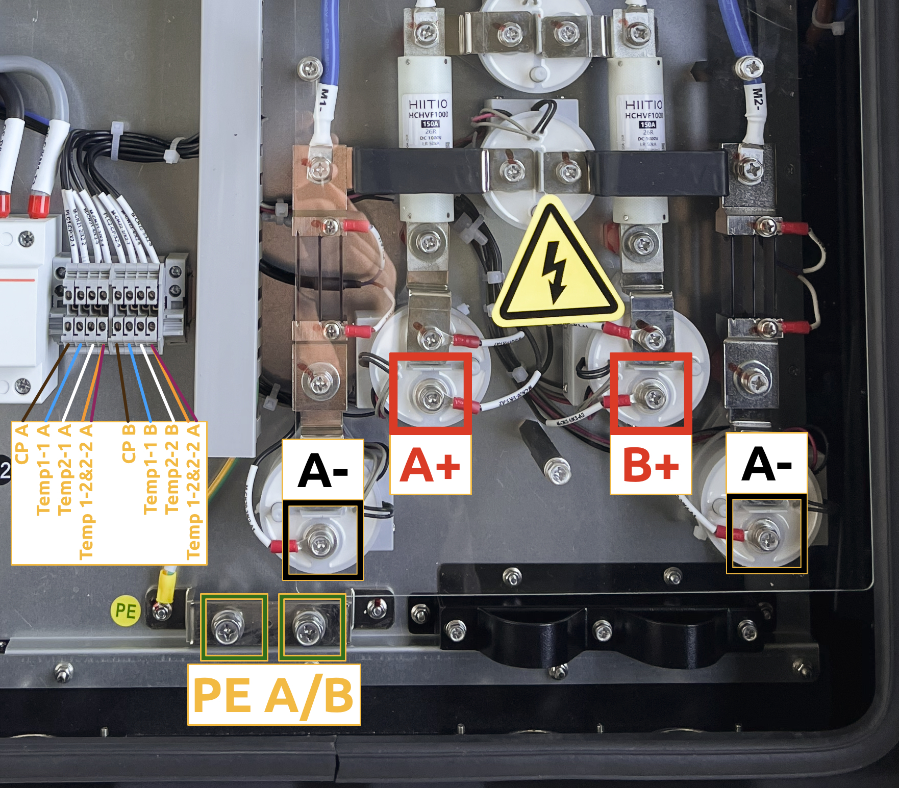 The colour combination and terminal connection sequence are the same for all charger models. Just use the image below as a reference and connect both the DC cable line and the communication wires.